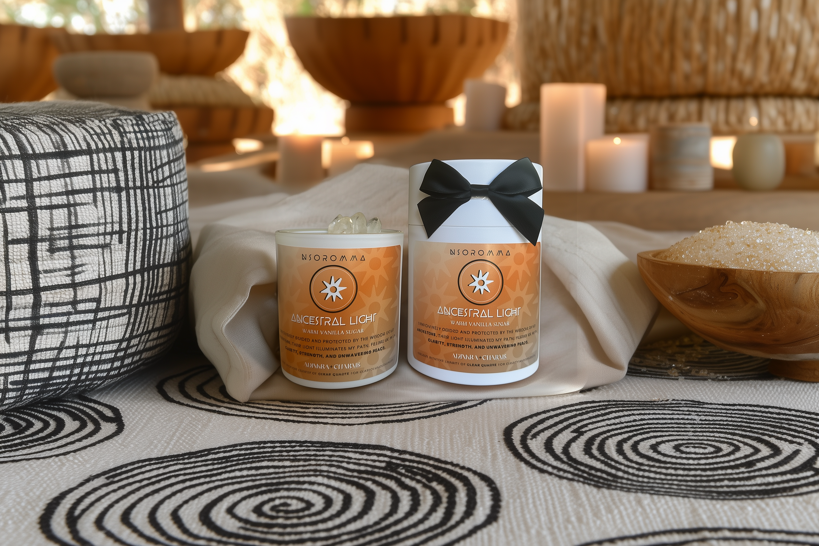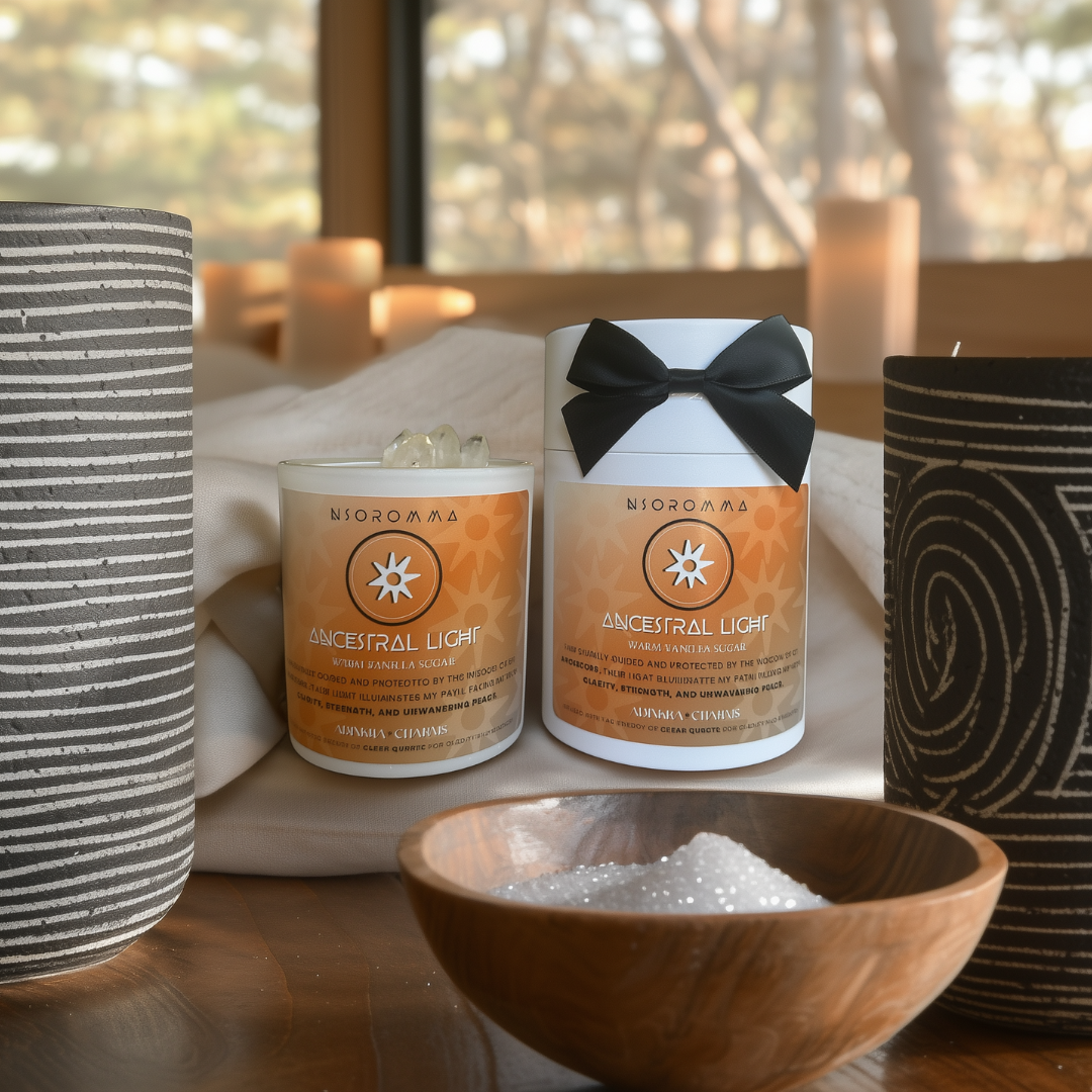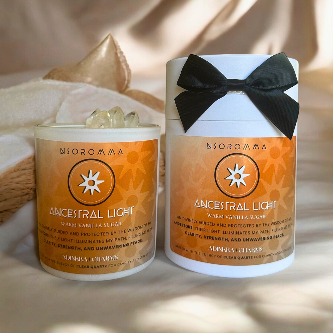 Designed for those who seek comfort, guidance, and divine connection, Ancestral Light is more than a candle—it’s a luminous bridge between past, present, and future. Inspired by the Adinkra symbol Nsoromma, meaning “Child of the Heavens”, this candle serves as a reminder that you are always watched over, loved, and supported by your ancestors and the universe. Whether used in meditation, reflection, or moments of stillness, it invites warmth, peace, and ancestral wisdom into your space.