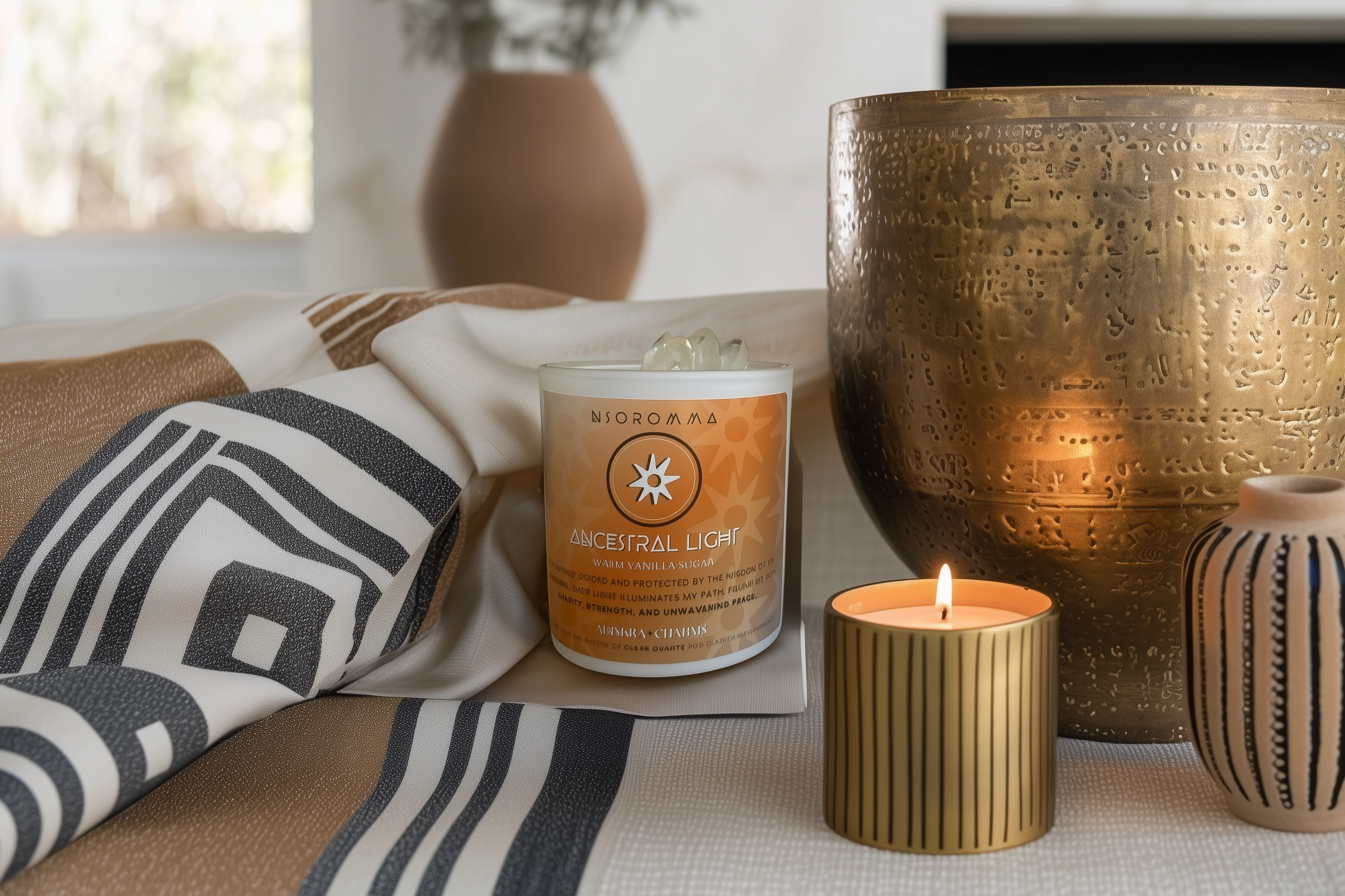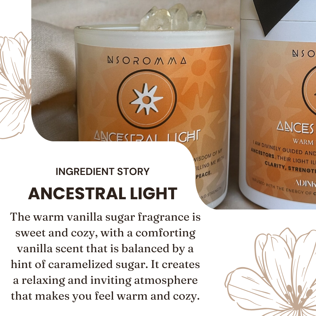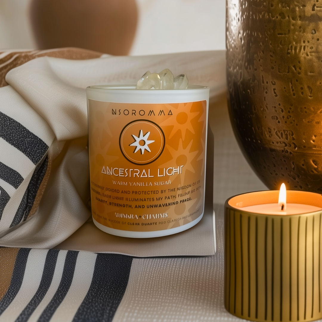 Designed for those who seek comfort, guidance, and divine connection, Ancestral Light is more than a candle—it’s a luminous bridge between past, present, and future. Inspired by the Adinkra symbol Nsoromma, meaning “Child of the Heavens”, this candle serves as a reminder that you are always watched over, loved, and supported by your ancestors and the universe. Whether used in meditation, reflection, or moments of stillness, it invites warmth, peace, and ancestral wisdom into your space.