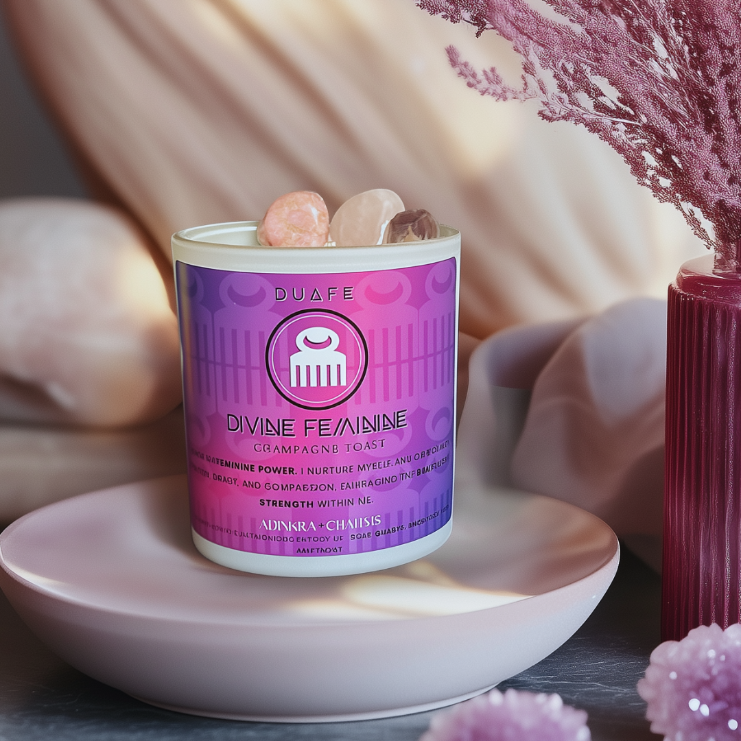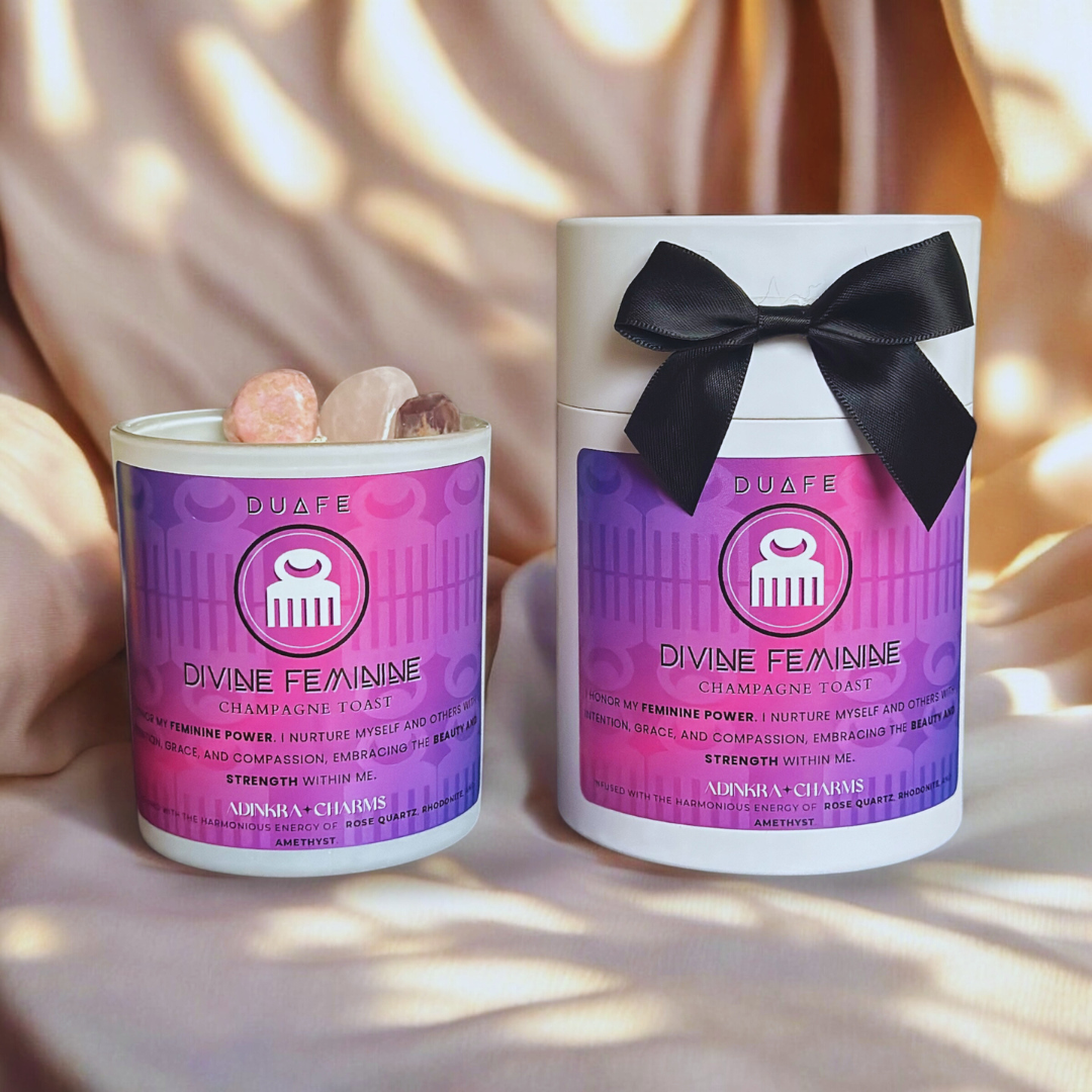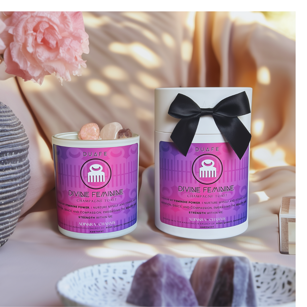 Designed for those who embrace grace, self-love, and inner strength, Divine Feminine is more than a candle—it’s a celebration of beauty, harmony, and the power within. Inspired by the Adinkra symbol Duafe, representing cleanliness, love, and feminine virtues, this candle was created to nurture self-care, emotional balance, and radiant energy. Whether used in meditation, intention-setting, or daily rituals, it serves as a reminder to honor the divine feminine essence within you.