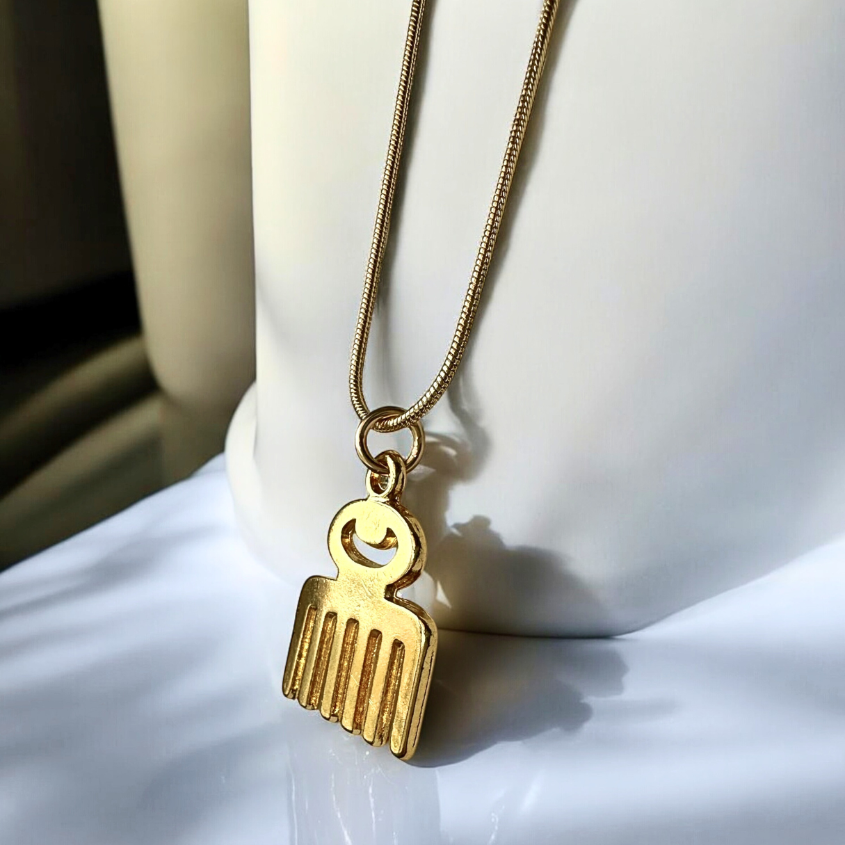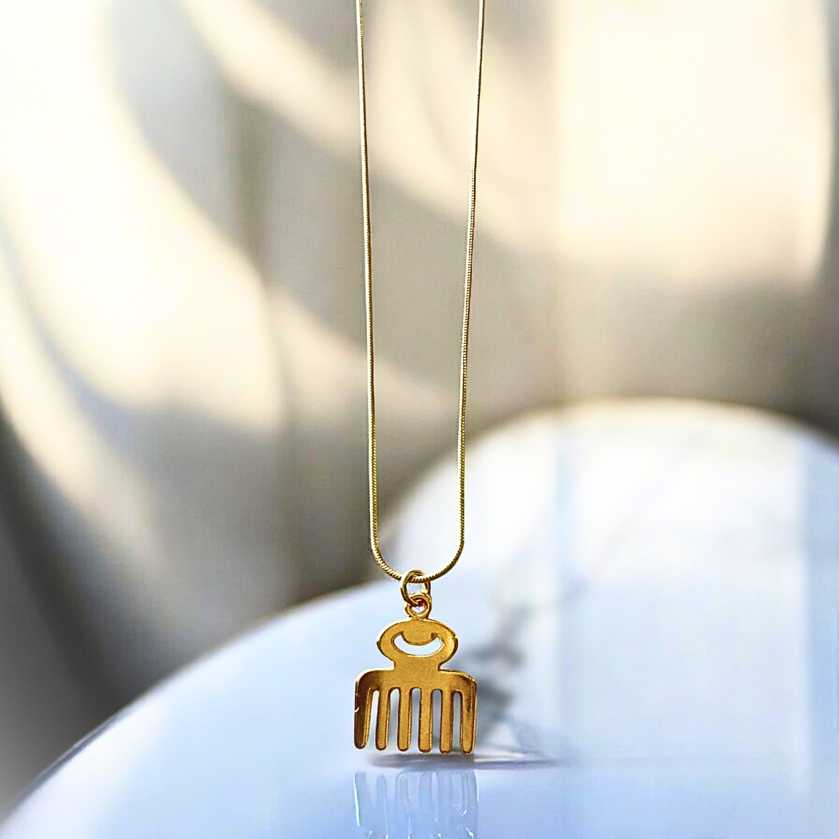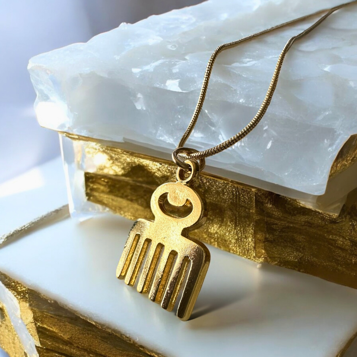 Carefully crafted from premium gold filled material, this necklace features the Adinkra Duafe symbol, representing the essence of beauty and the nurturing spirit. The 18KT gold plated charm brings out the intricate detailing of this symbol, celebrating the importance of embracing and celebrating one’s unique beauty, both inside and out.
