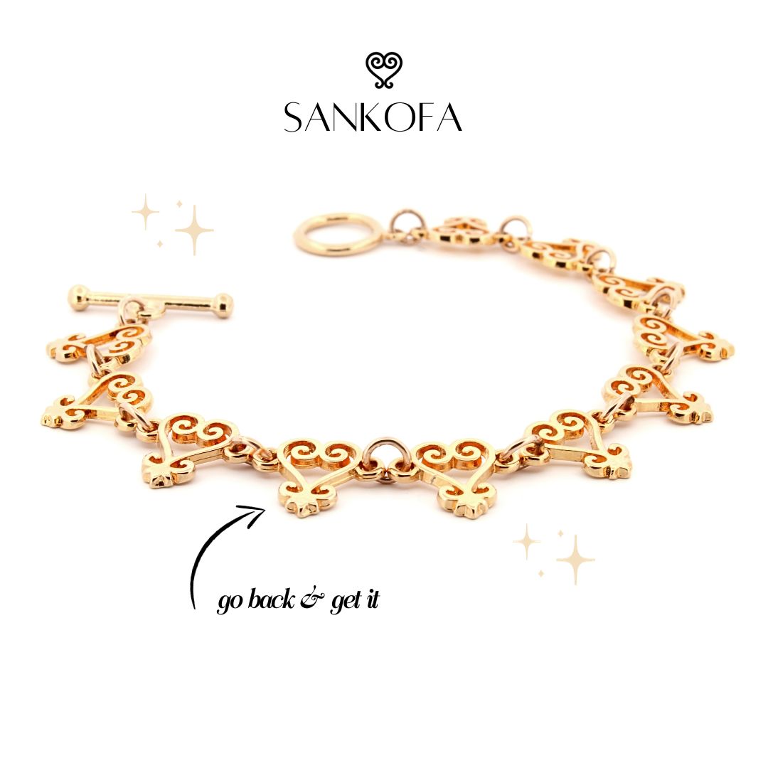 This bracelet, exquisitely plated in 18k gold, is dedicated to the Sankofa symbol, renowned for its message of reflecting on the past to build a successful future. It showcases up to ten intricately detailed Sankofa charms, each contributing to a rich narrative of wisdom and heritage.
